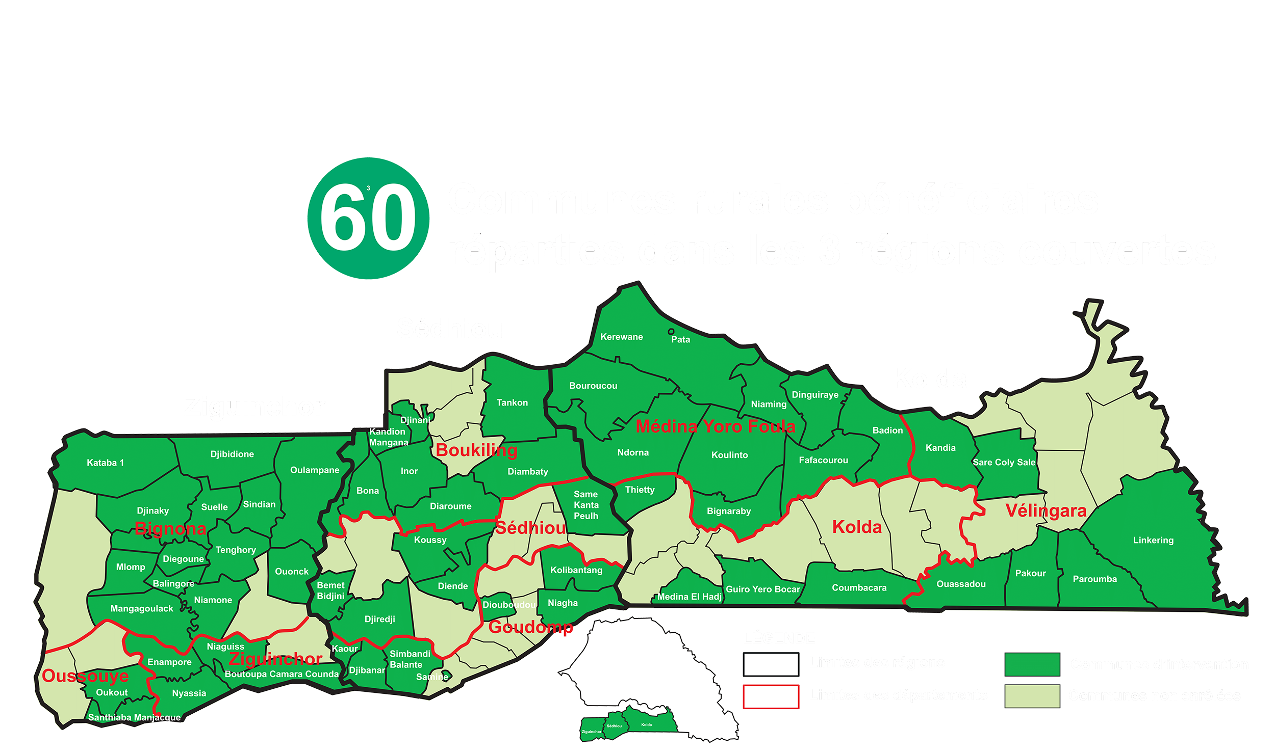 Le PDEC agit au cœur de la Casamance naturelle, dans les régions de Ziguinchor, Sédhiou et Kolda.